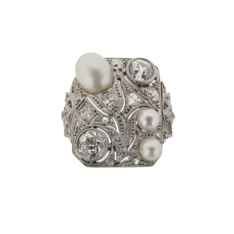 An Edwardian pearl and diamond plaque ring, of pierced foliate form and millegrain set with graduated circular cut diamonds and three pearls. Platinum mount. Size P 1/2.