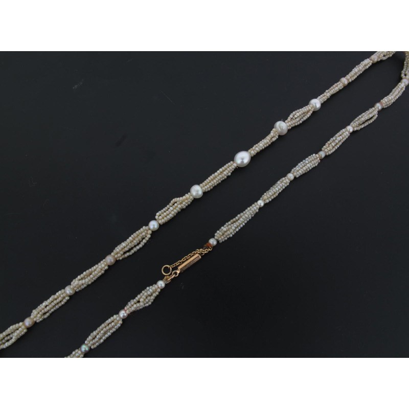 A five row seed pearl necklace, spaced with twenty four graduated larger pearls. Gold barrel clasp. 47.5cm long.