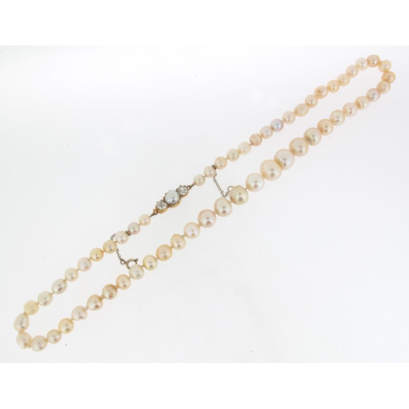 A single row graduated pearl necklace, the fifty seven natural pearls graduate from 5.2 to 10.2mm. the gold clasp set with a pearl and two cushion shaped diamonds. 45cm. 30.43g in total.