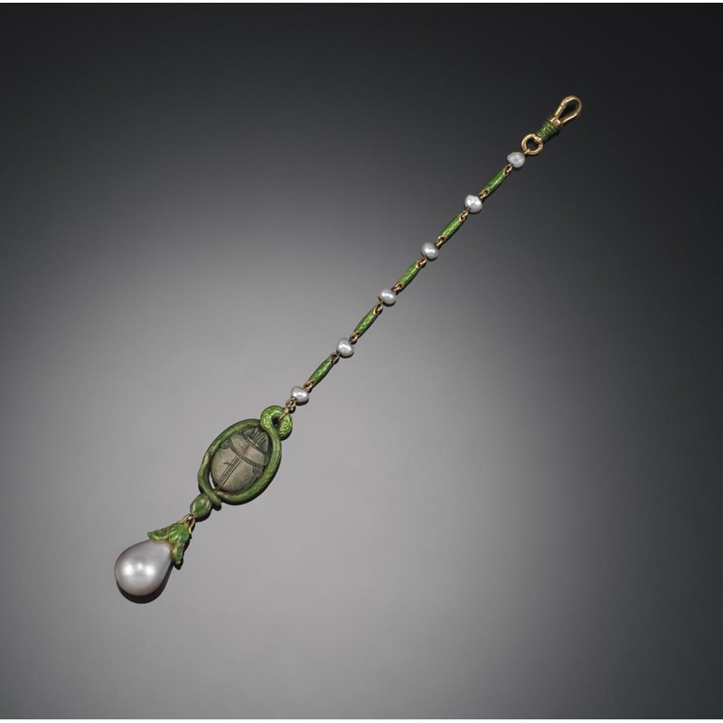An early 20th Century pearl pendant, the pear shaped natural pearl suspends from a gold foliate cap decorated with green enamel, suspended from a realistically formed faience scarab. Engraved to the reverse with hieroglyphics. Mounted within a snake form frame decorated with green enamel, on a chain alternately formed with green enamel gold bar links and seed pearls. Green enamel decoration to the gold swivel clip. 16cm in total.