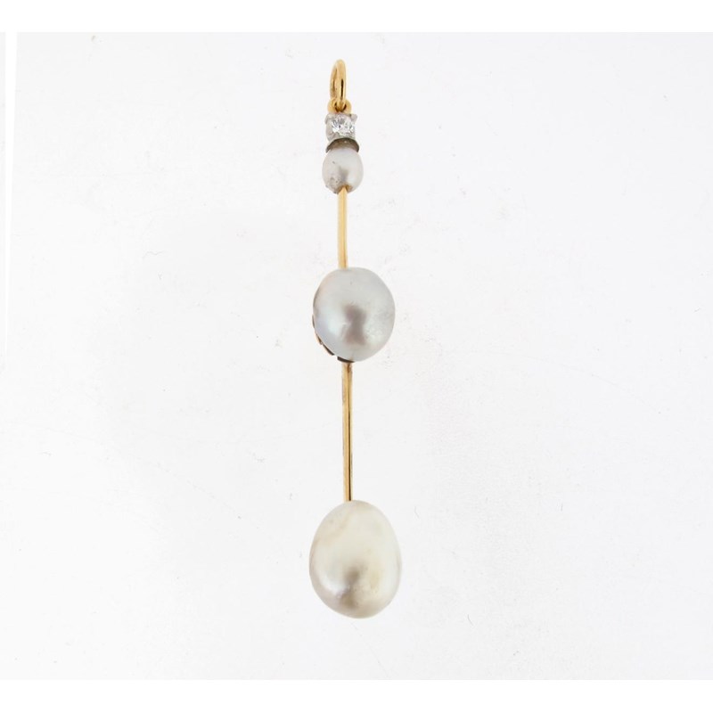 A gold pendant mounted with three natural pearls and a diamond. 5.5cm high.