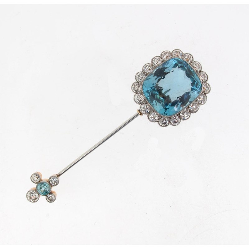 An Edwardian aquamarine and diamond jabot pin, the cushion shaped aquamarine is millegrain set within a surround of circular cut diamonds, the terminal set with a circular cut zircon and four further diamonds. 6.6cm long.