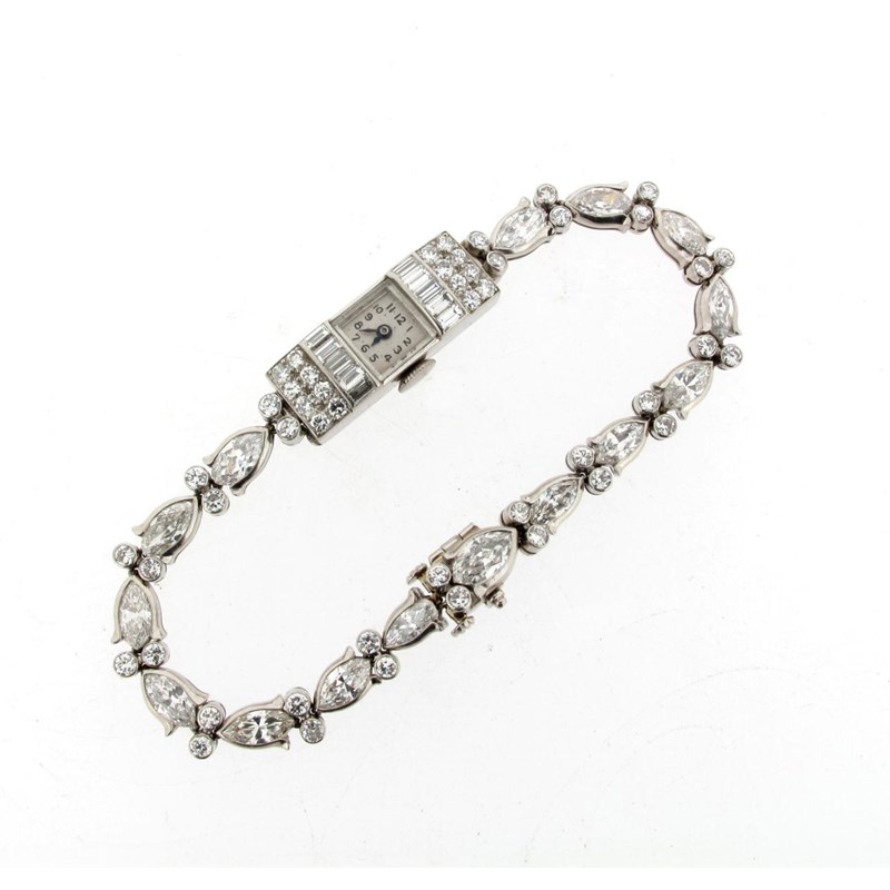 A diamond set dress wristwatch, the square dial with black Arabic numerals, the shoulders set with baguette shaped and circular cut diamonds in platinum. The band alternately mounted with marquise shaped and pairs of circular cut diamonds in platinum. The movement signed Eterna and numbered 2627225. 17cm.