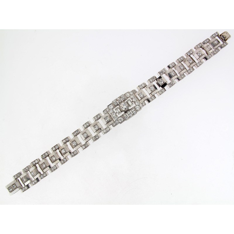 An Art Deco diamond set platinum stylised tank track bracelet, centred with a circular cut and two baguette shaped diamonds with further diamonds set to the articulated links. With partially rubbed makers mark, possibly French. 17.5cm. Fitted case by Nicaud of Dinard.