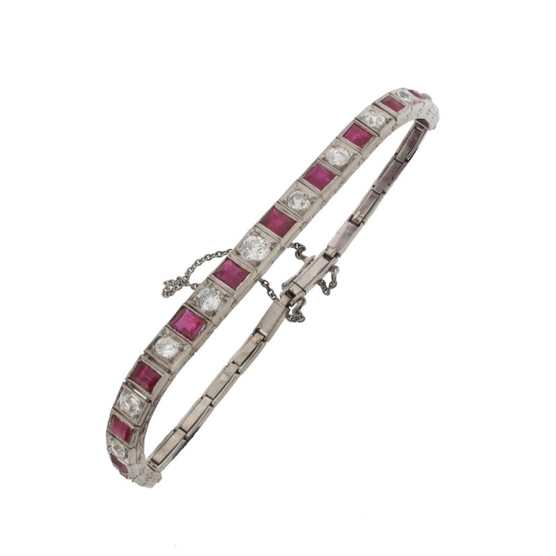 An Edwardian ruby and diamond line bracelet, alternately set with graduated square shaped rubies and old circular cut diamonds in white gold. Foliate engraved sides.