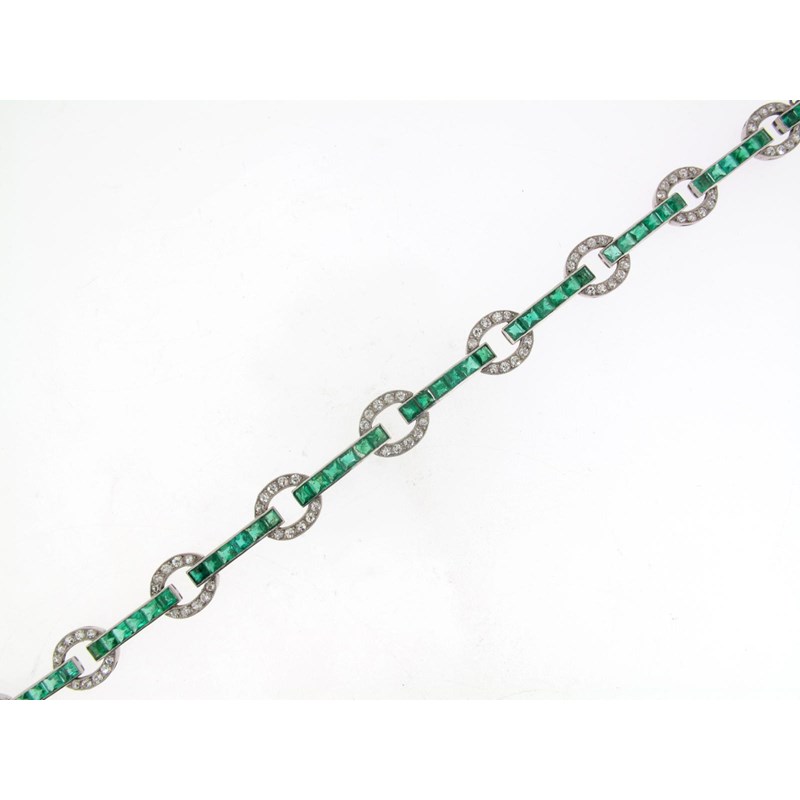An emerald and diamond bracelet, the oval sections are millegrain set with circular cut diamonds and joined with lines of square shaped emeralds in white gold. 18cm long.