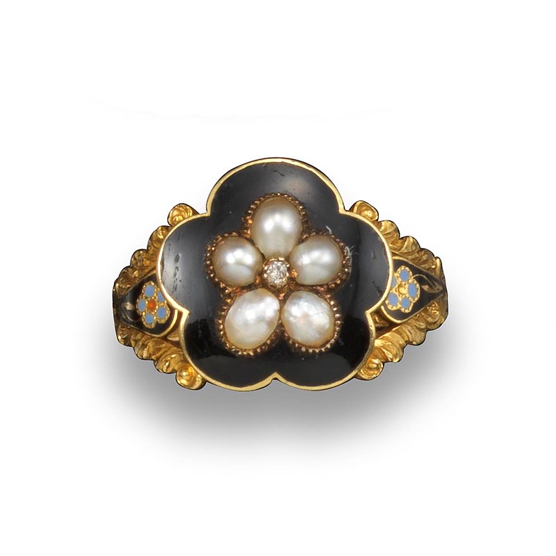 A William IV gold mourning ring, the flower head top section centred with a small diamond between five seed pearls on black enamel ground, engraved with scroll decoration to the bifurcated shoulders and with further enamel decorated forget-me-nots, London marks for 1830 and maker CG, size O