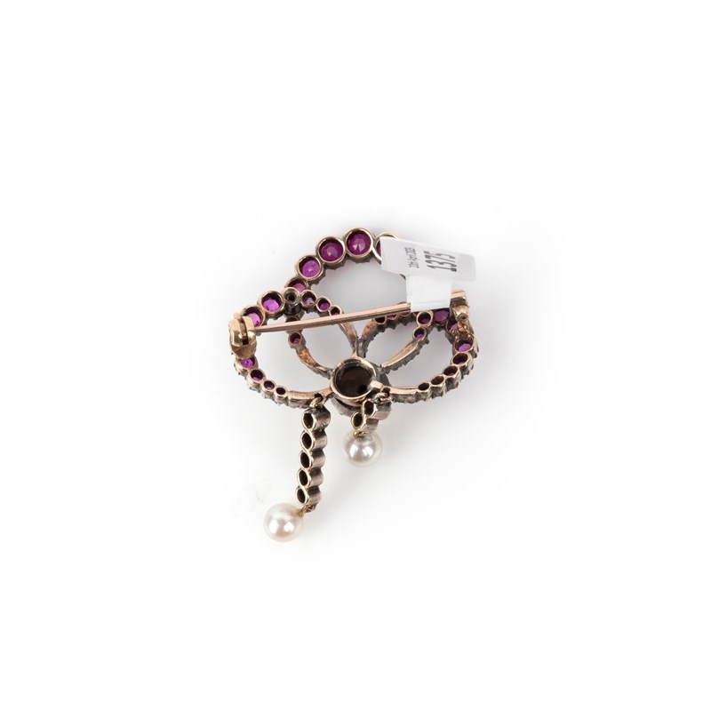 A late 19th century (composite) pink sapphire and cultured pearl brooch, the three interlocking circles set with pink sapphires, suspending two pink sapphire and cultured pearl drops in silver and gold, width 3.2cm