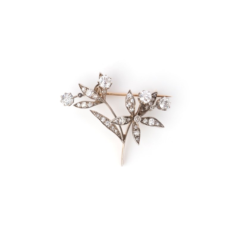 A late 19th century diamond foliate brooch, set with graduated old cushion-shaped diamonds in silver and gold, length 3.5cm