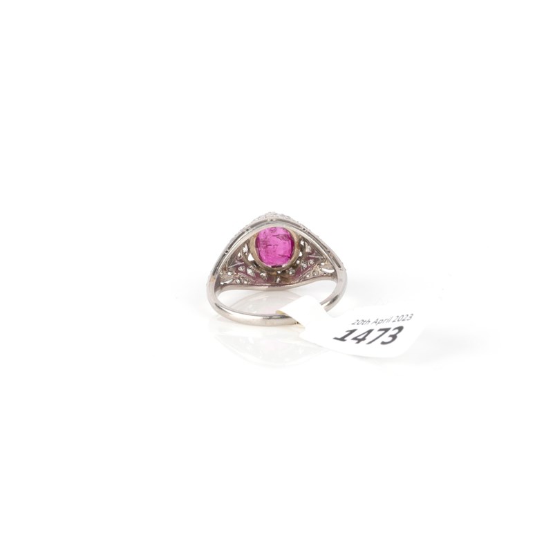 An early 20th century ruby and diamond ring, the oval ruby within millegrain-set diamond surround in platinum, French import mark, size N 1/2