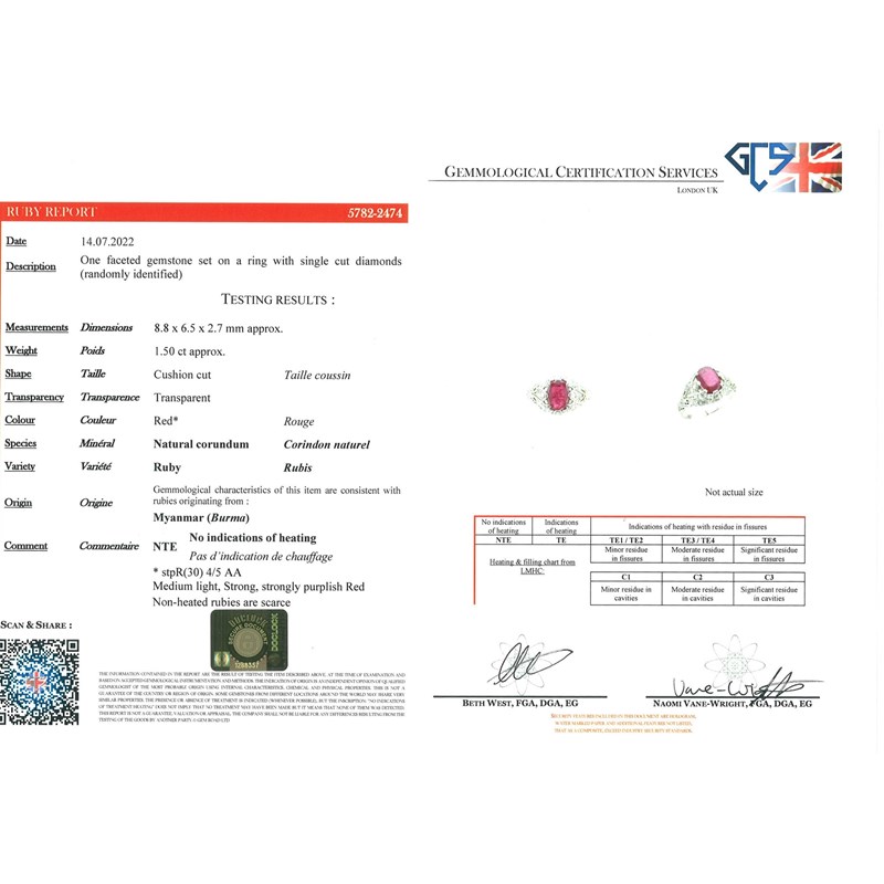 Accompanied by GCS report number 5782-2474, stating that the ruby weighs approximately 1.50cts, origina: Burma, no indications of heating