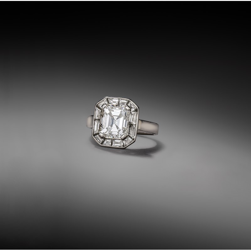 A diamond cluster ring, claw-set with a step-cut diamond weighing 3.01 carats, within a border of channel-set baguette and trapezoid diamonds, mounted in platinum, size L, British hallmarks, case stamped Longmire