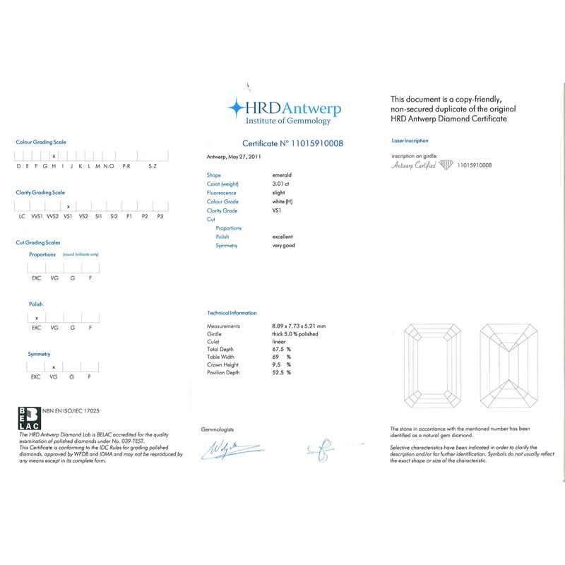Accompanied by HRD report no. 11015910008, dated May 27th 2011 stating that the 3.01 carat diamond measuring 8.89 x 7.73 x 5.21mm is H colour, VS1 clarity, with slight fluorescence