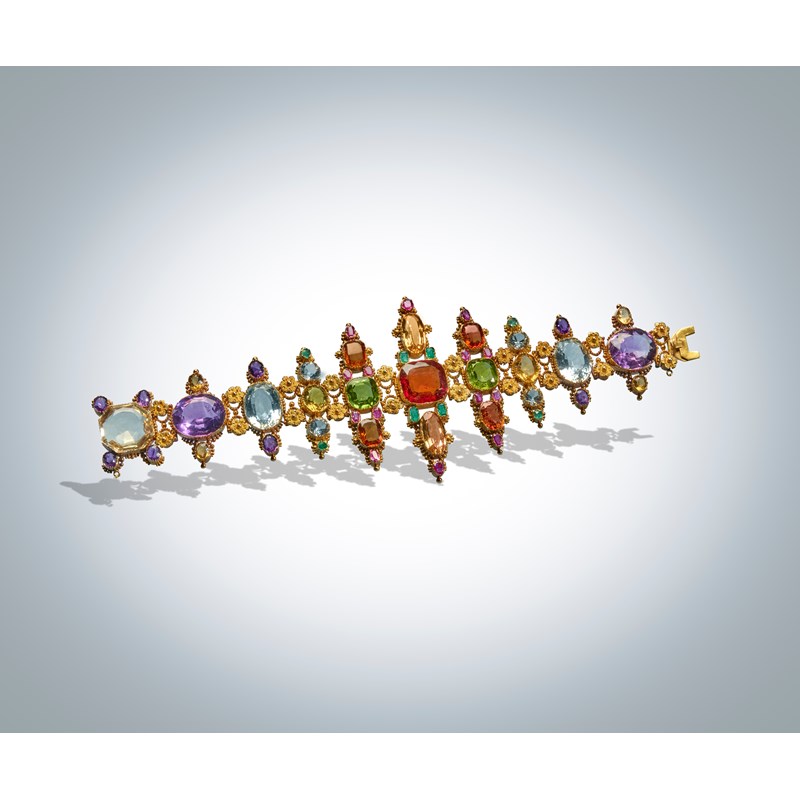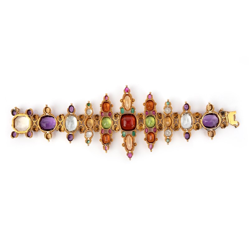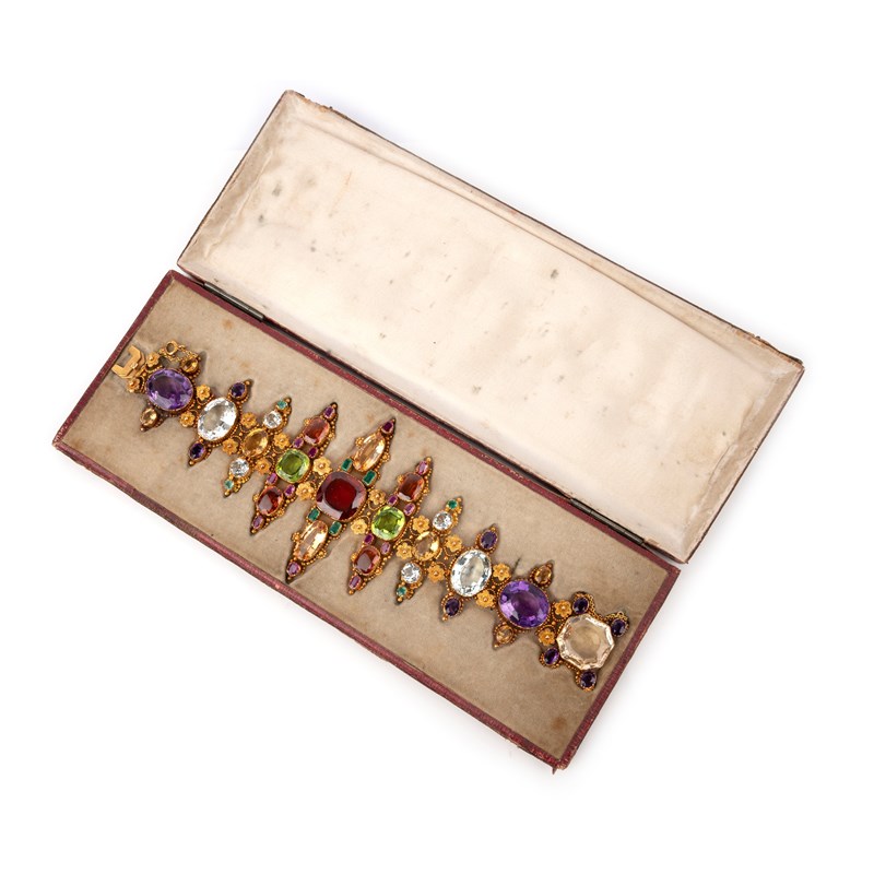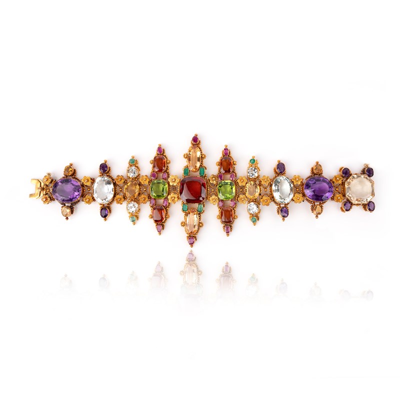 A fine gold and gem-set bracelet, 1830s, composed of graduated vertical bar-shaped links set with a variety of oval and cushion-shaped gemstones including hessonite garnet, topaz, peridot, amethyst, citrine and aquamarine, accented with smaller emeralds, rubies, citrines and amethysts, each within gold collet settings embellished with gold beaded and floral decoration, length 18cm, width at front 6.4cm, original fitted case