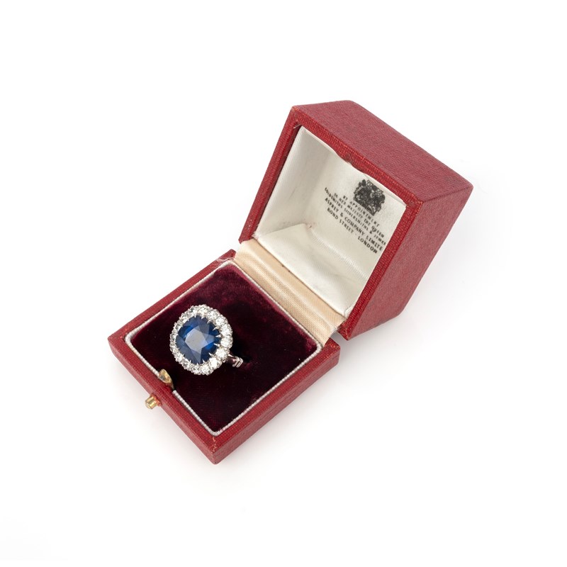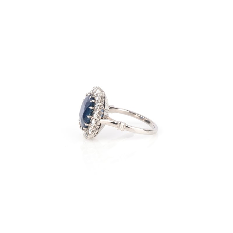 A sapphire and diamond cluster ring, the cushion-shaped sapphire claw-set within a surround of 16 circular-cut diamonds in platinum, size N 1/2, case