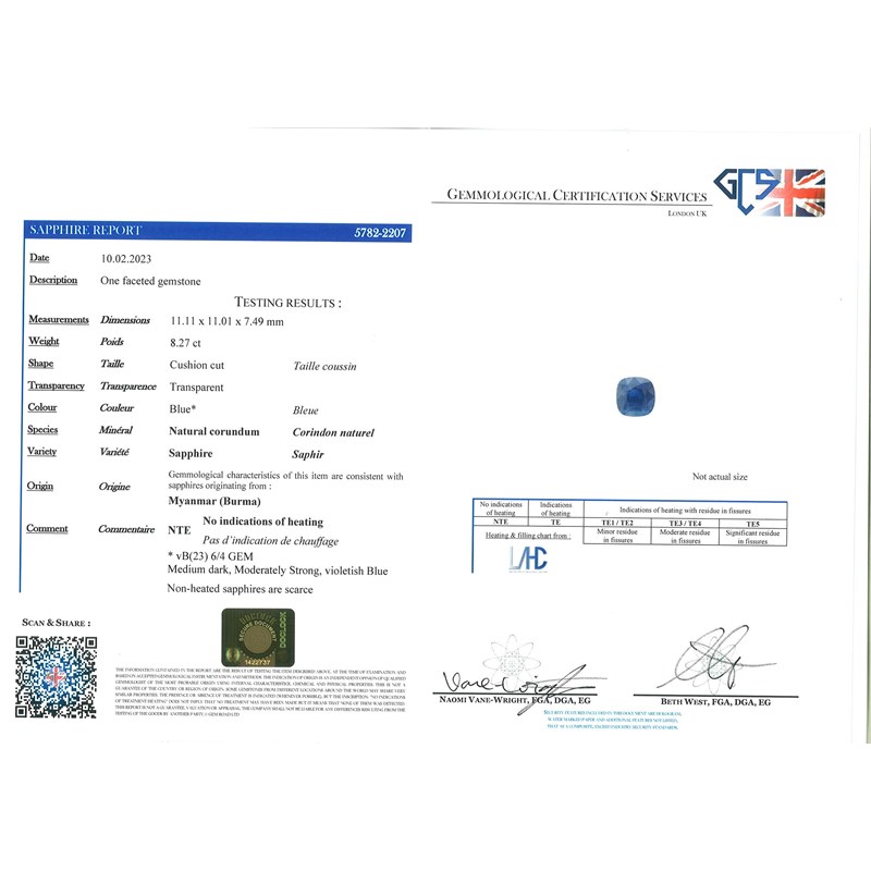 Accompanied by report number 5782-2207 from GCS dated 10th February 2023 stating that the sapphire weighs 8.27cts, is a natural sapphire, Burma, no indications of heating
