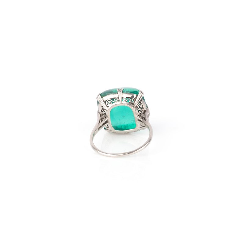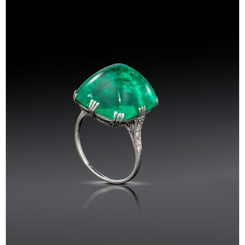 A fine Art Deco emerald ring, circa 1920, claw-set with a large sugarloaf cabochon emerald, to a fine platinum mount with rose-cut diamond shoulders and a scrolled gallery, size M1/2
