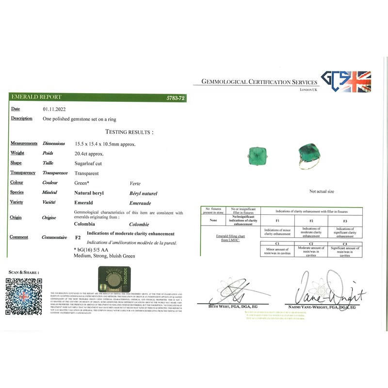 Accompanied by GCS report no. 5783-72, stating that the emerald measuring approximately 15.5 x 15.4 x 10.5mm is of Colombian origin, with indications of moderate clarity enhancement.