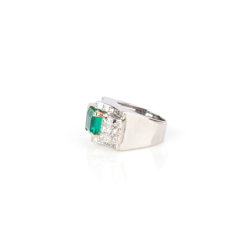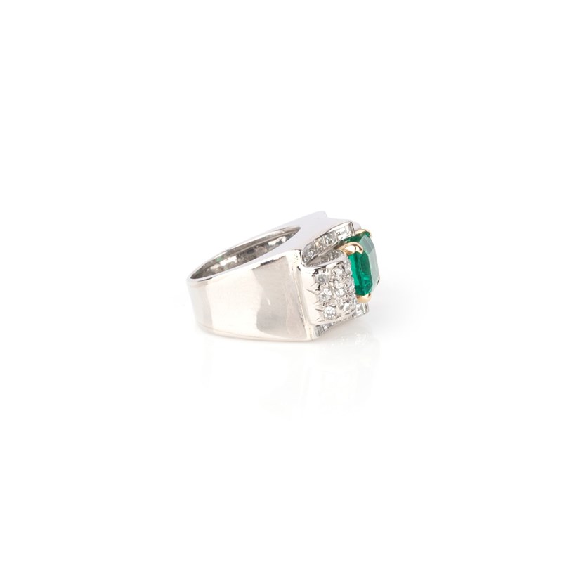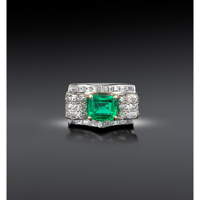 An emerald and diamond-set Odeonesque ring, C1935, the emerald-cut emerald weighs 2.07cts with pave-set round circular-cut diamond raised scroll shoulders and baguette-shaped diamond raised borders in platinum, indistinct letters and numbers stamped to upper inside shank, size H 1/2