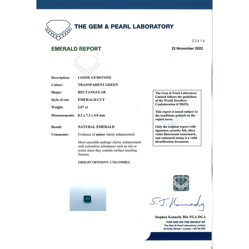 Accompanied by GPL report number 22416 dated 22nd November 2022 stating that emerald weighs 2.07cts, origin: Colombia, evidence of minor clarity enhancement