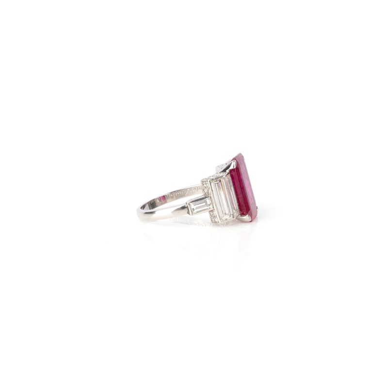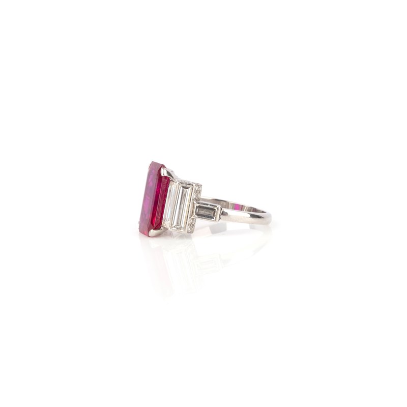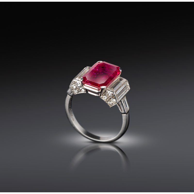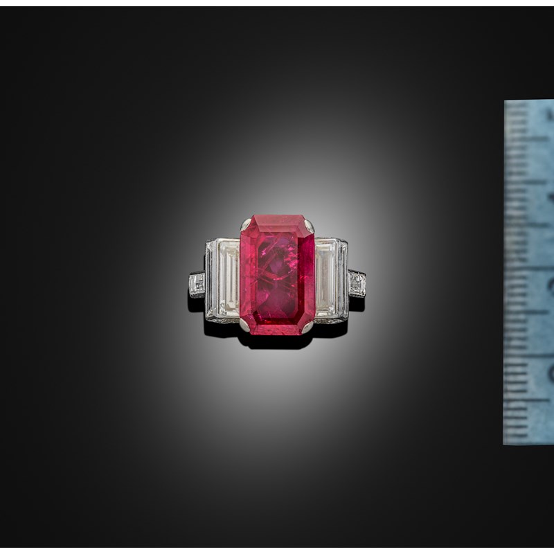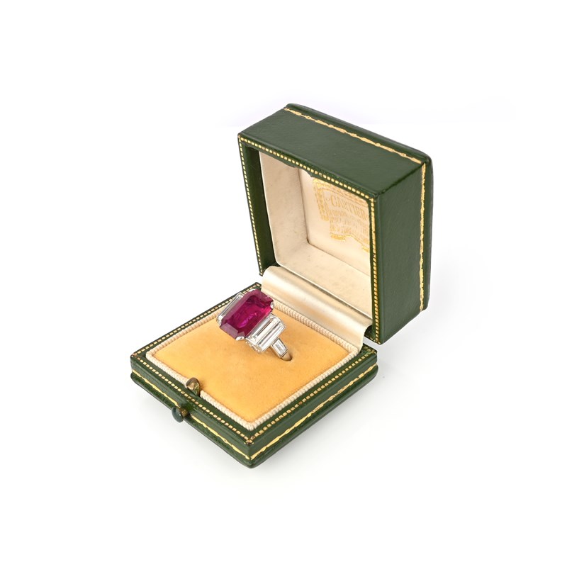 Cartier, an Art Deco ruby and diamond ring, C1935, the emerald-cut ruby measuring 13.04 x 8.10 x 3.95mm which calculates to approximately 4.10cts, within geometric shoulders set with two elongated baguette-shaped diamonds and a further baguette-shaped diamond, the gallery pave-set with circular diamonds in platinum, signed Cartier London, size N, green Cartier leather case