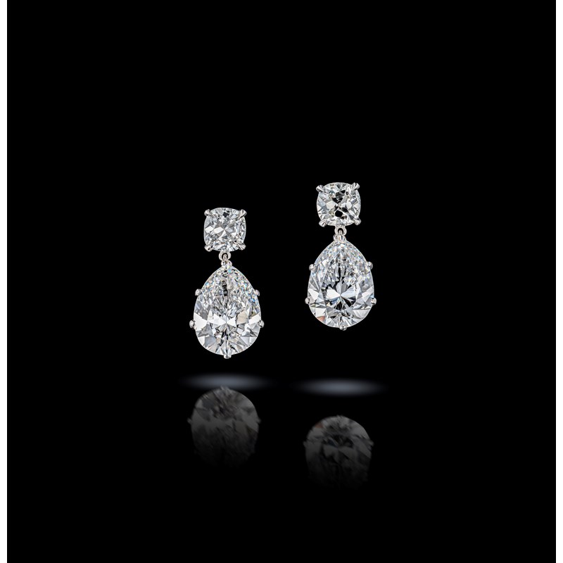 A pair of impressive diamond drop earrings, set with a cushion-shaped diamond weighing approximately 1.05cts each, suspending a pear-shaped diamond weighing 4.11cts and 4.14cts respectively, set in platinum, post fittings, length 2.1cm