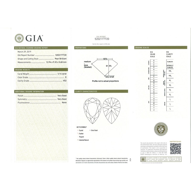 Accompanied by GIA report number 1206177718 dated 29th March 2019 stating that diamond weighs 4.14cts, E colour VS2 clarity, fluorescence none