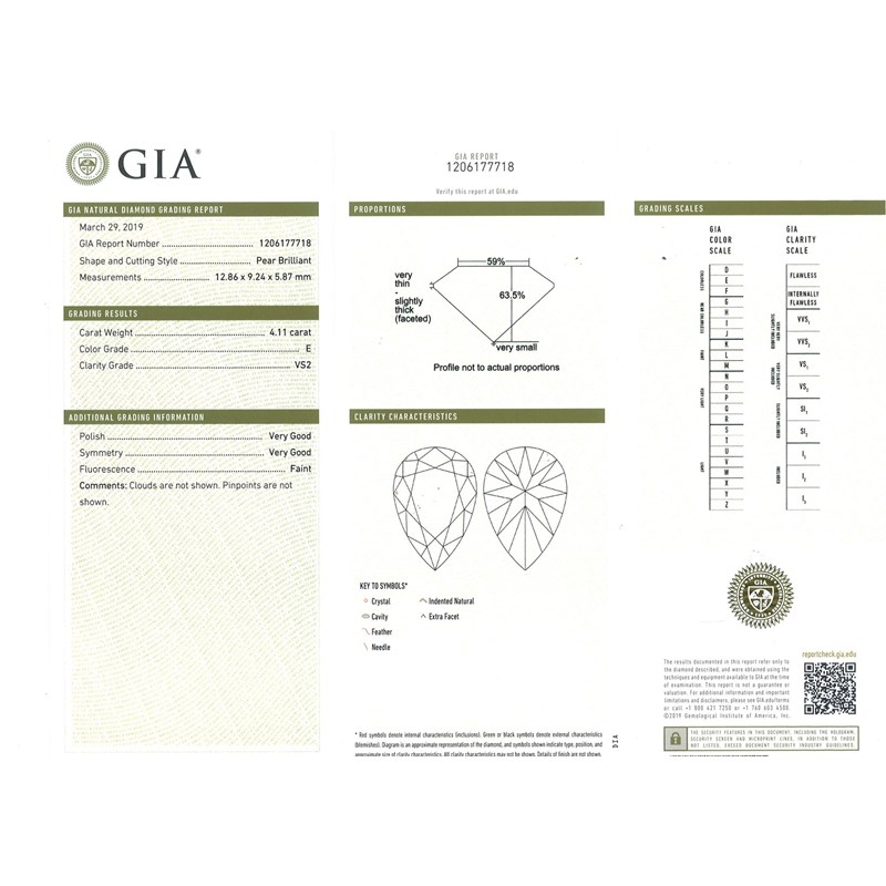 Accompanied by GIA report number 1206177718 dated 29th March 2019 stating that diamond weighs 4.11cts, E colour VS2 clarity, fluorescence faint