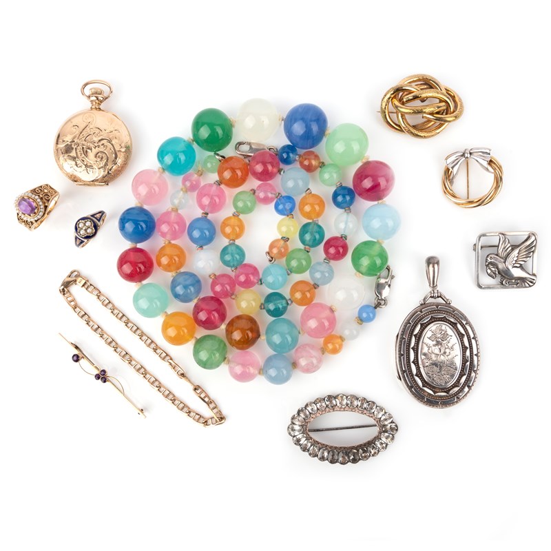 A collection of jewellery incuding a pocket watch