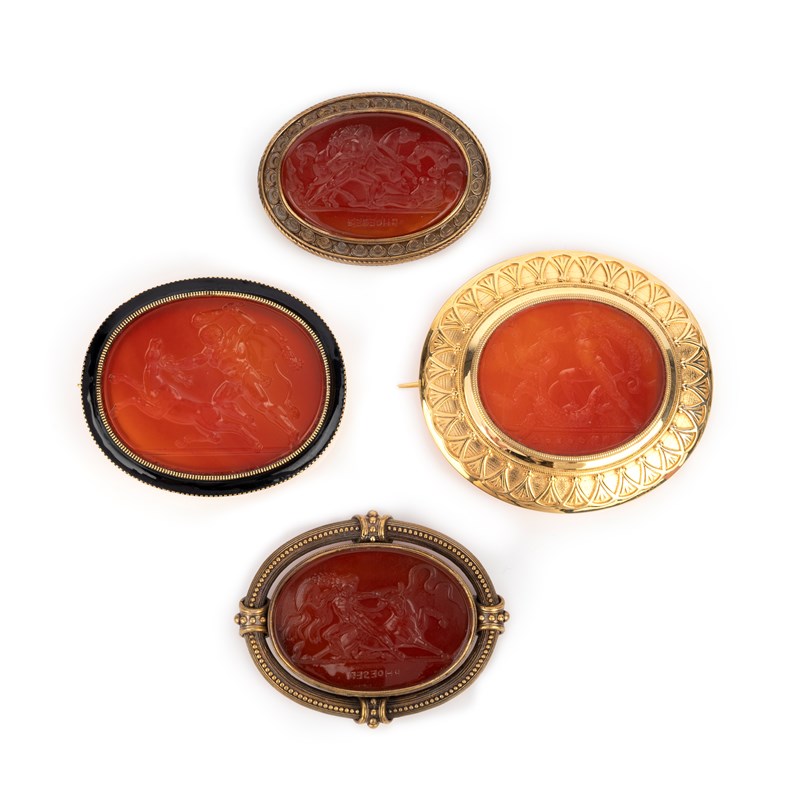 A group of four carnelian intaglio brooches, the brooches each set with a modern intaglio depicting one of the labours of Hercules: slaying the Learnaean Hydra, capturing the Ceryneian hind, capturing the Cretan bull, and stealing the mares of Diomedes, after neoclassical originals from the collection of Prince Stanislas Poniatowski, each mounted in gilt metal, one applied with black enamel, largest brooch 5.5 x 5.0cm