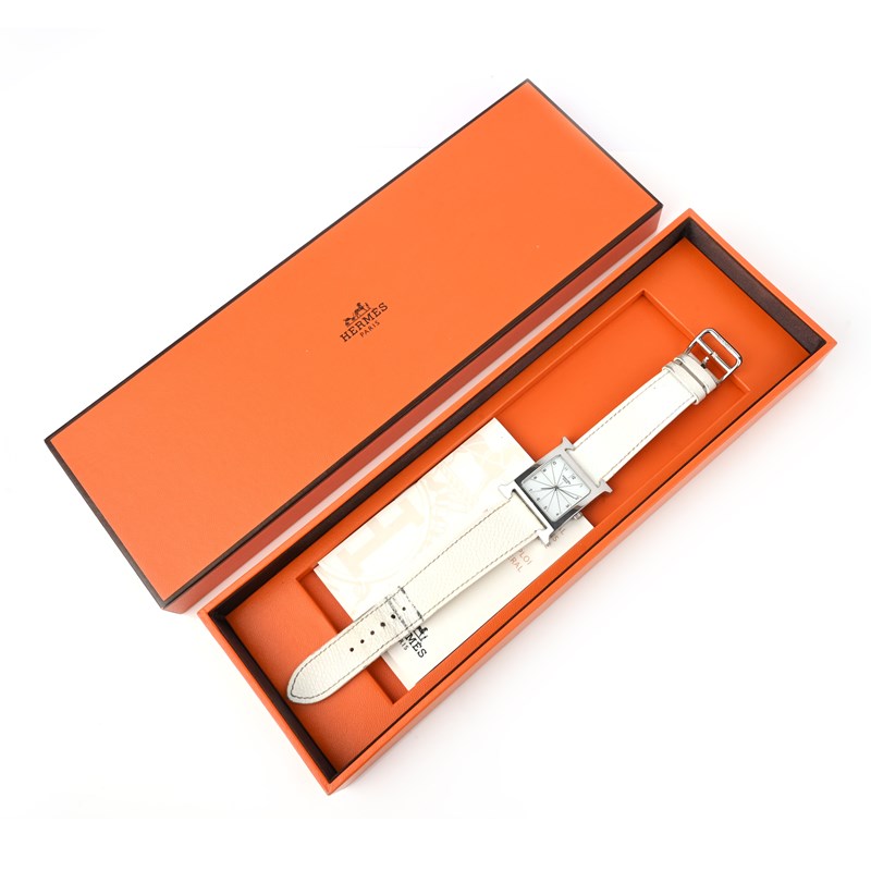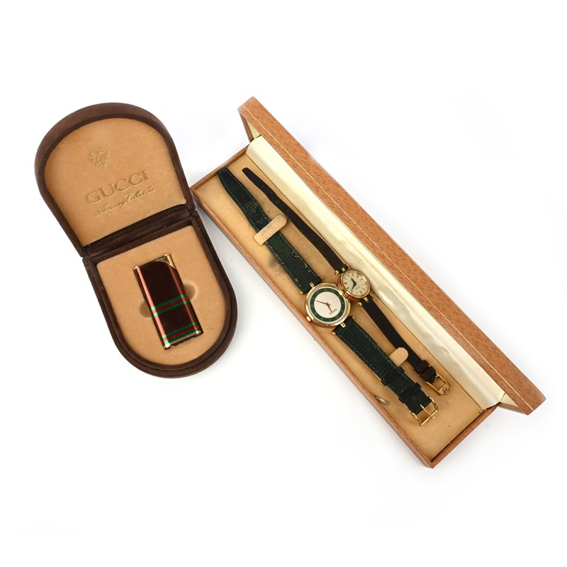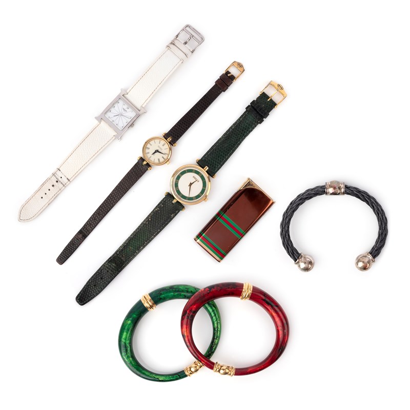 A group of signed watches and accessories, comprising: a stainless steel 'Heure H' watch by Hermès, ref. HH1.510, box and papers; a silver and blackened steel torque bangle by Paloma Picasso for Tiffany & Co., case and pouch stamped Tiffany & Co.; two Gucci watches and a Gucci lighter, two cases stamped Gucci; together with a pair of hinged enamel and gold bangles, in red and green respectively, unsigned, stamped 750
