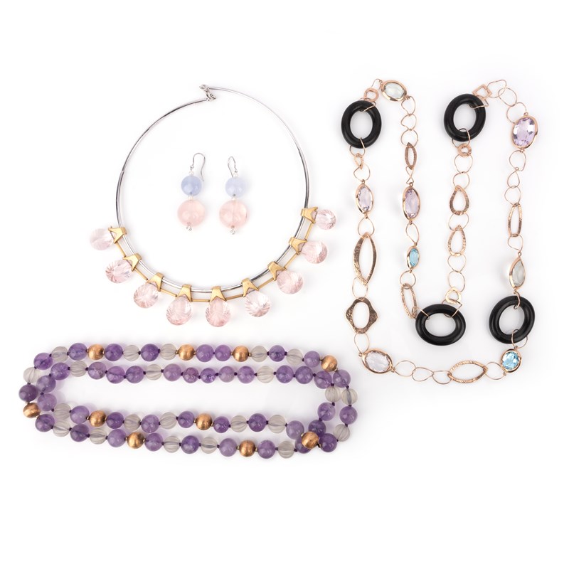 A collection of jewellery, comprising: a collar suspending a fringe of pear-shaped rose quartz pendants, inner circumference 38cm, Italian maker's mark, stamped 750; a pair of drop earrings set with polished blue chalcedony and rose quartz, accented with cultured pearls and brilliant-cut diamonds, hook fittings; a necklace composed of variously-shaped gold links, wooden hoops and spectacle-set links of oval rock crystal, amethyst and blue topaz, length 86cm, stamped 375, French import assay marks for 9ct gold; and a necklace composed of fluted rock crystal beads, spherical amethst beads and brushed gold beads, length 87cm