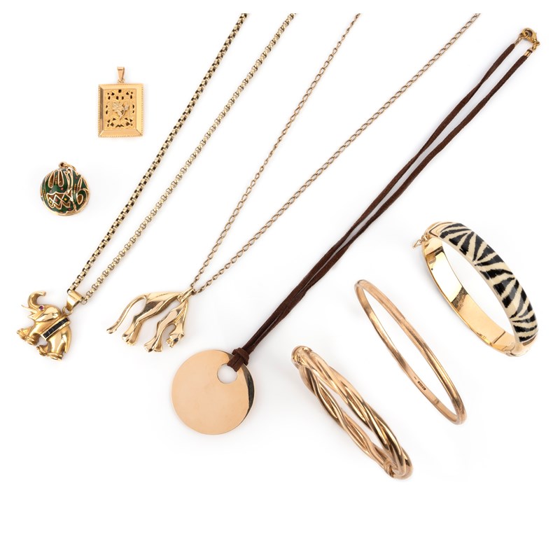 A collection of gold jewels, comprising: an enamelled bangle of zebra stripe design, marked 750, Italy; a plain solid bangle, British hallmarks for 9ct gold; a bangle of rope twist design, stamped 975, Italian maker's mark; a gold and enamel pendant opening to reveal an Arabic inscription; a gold panther pendant, stamped 585; suspended from a 9ct gold chain, British hallmark; a rectangular gold pendant with a design of floral openwork; a gold pendant depicting an elephant, set with calibré-cut sapphires and a cabochon ruby eye, stamped CETAS 750, to a belcher link chain necklace, stamped 585; and a gold disc pendant to a cord necklace, pendant stamped 750