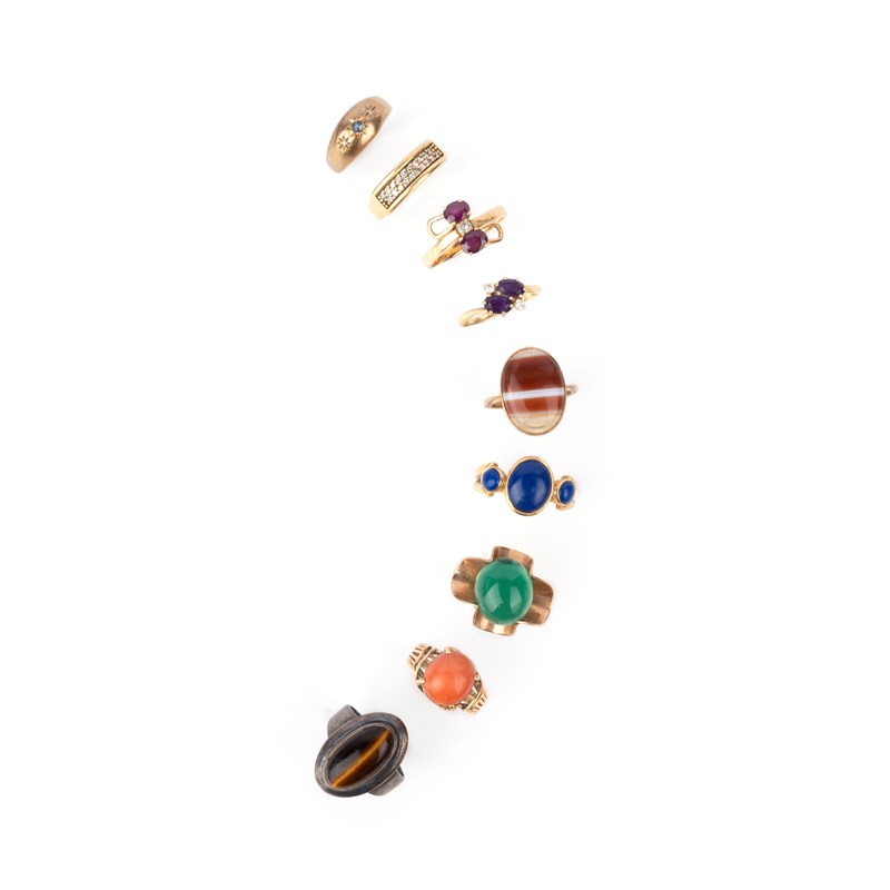 λ A collection of nine rings, comprising: an 18ct gold ring set with two rows of brilliant-cut diamonds, size Q1/2, British hallmarks; a gold and lapis lazuli ring, size S, Portuguese assay marks; a ruby and diamond ring, size R; an 18ct gold, amethyst and diamond ring, size O1/2, British hallmark; a 9ct gold ring set with a circular-cut sapphire and cushion-shaped diamonds, size M1/2, British hallmark; a banded agate cabochon ring in 9ct gold, size M1/2, British hallmarks; a green chalcedony cabochon ring in a quatrefoil mount, indistinct assay marks, size M1/2; a coral cabochon ring, size L1/2, indistinct assay marks; and a blackened silver ring set with a tiger's eye cabochon, size Q
