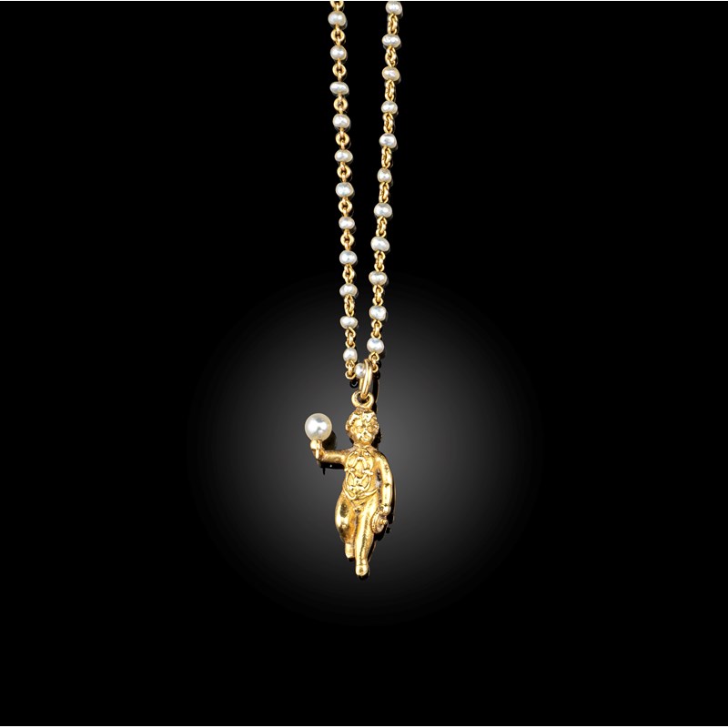A gold and pearl neckalce, late 19th century, the necklace composed of gold chain linking threaded with seed pearls, suspending a pendant in the Archaeological Revival style, modelled as a putto holding a pearl, necklace length 42cm, stamped 15ct, pendant length 3cm including jump ring, pearls untested