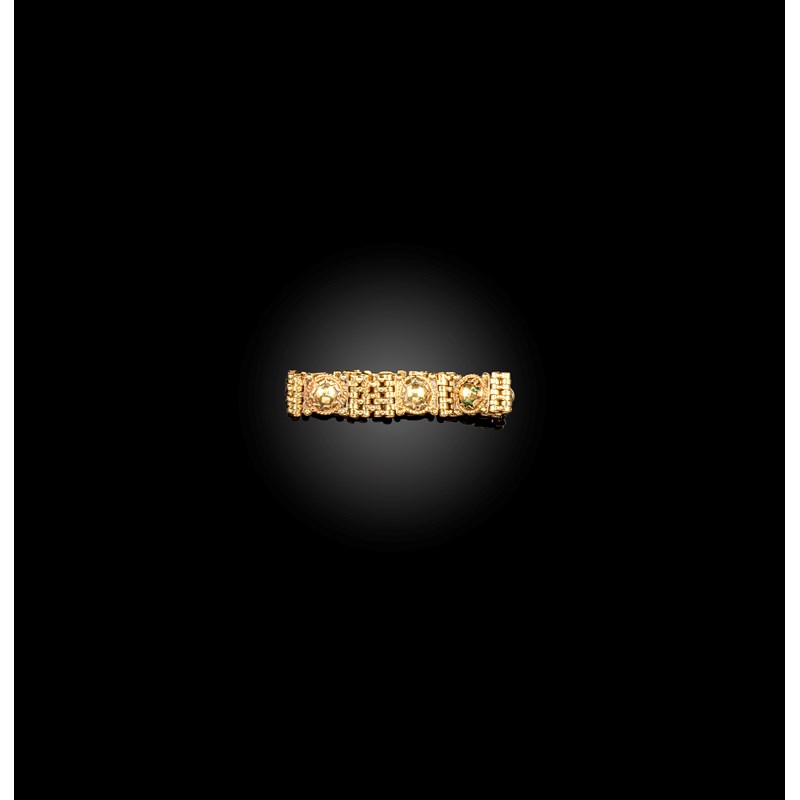 An articulated gold ring, 1860s, designed in the Archeological Revival style, composed of domed floral motifs connected by gate linking, size N