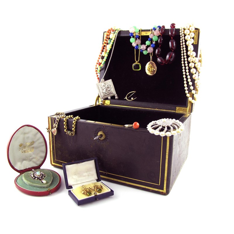 A leather jewellery casket with Bramah lock containing various items of jewellery