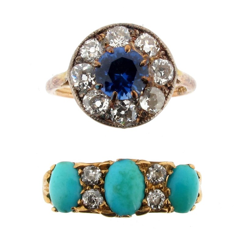 A turquoise and diamond half hoop ring, set with three graduated oval-shaped turquoise cabochons and four circular-cut diamonds in carved and pierced yellow gold shank. Size L 1/2. With a synthetic sapphire and diamond cluster ring, the circular-cut synthetic sapphire is set within a surround of circular-cut diamonds in silver and gold. Size M.