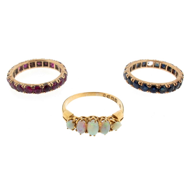 A sapphire full circle eternity ring, (one stone missing), set in yellow gold, size P. A matching ruby full circle eternity ring. Size O 1/2. And an opal five stone ring, set in yellow gold, size N 1/2.