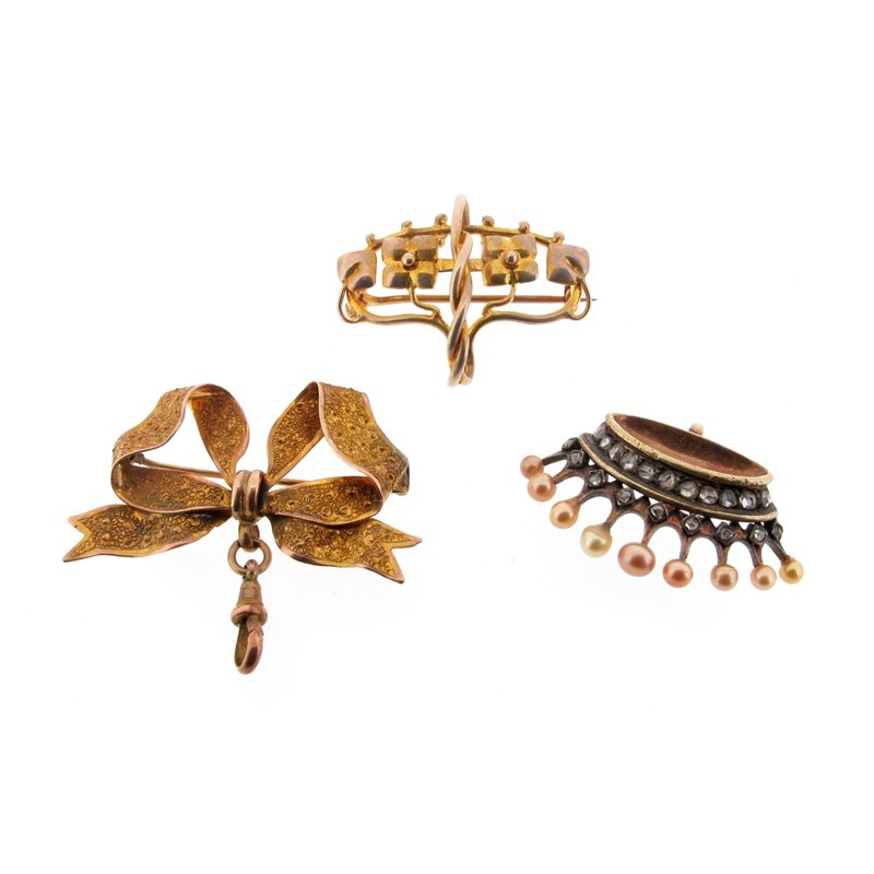 An Art Nouveau gold fob brooch, a gold fob brooch designed as a stylised bow and a silver and gold coronet fob brooch set with diamonds and pearls.
