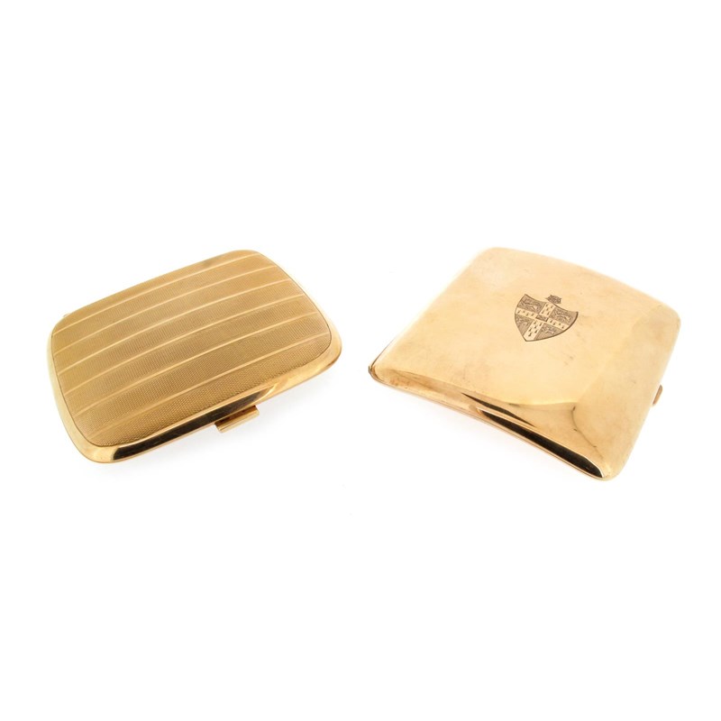 A 9ct gold cigarette case, of rectangular form with rounded corners and engine turned decoration. Birmingham marks for 1922. With another 9ct gold cigarette case. Engraved with the arms of Cambridge University. Birmingham marks for 1919. 158g in total.