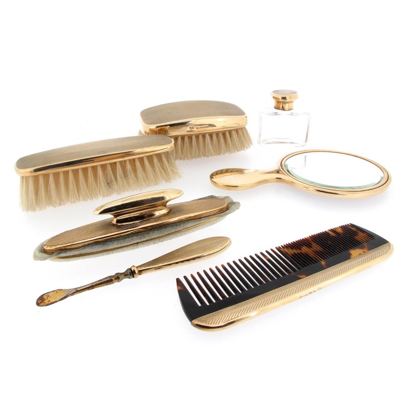 A lady's gold mounted toilet set, incorporating two brushes, a tortoiseshell comb, a nail buffer, a tongue scraper, a mirror and a perfume bottle. All mounted in 9ct gold with engine-turned decoration.