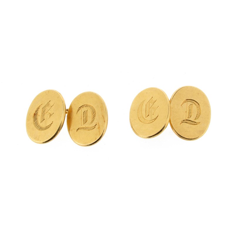 A pair of oval-shaped 18ct yellow gold cufflinks, the solid gold discs are alternately engraved with the intials T and E. Maker's mark G & S. Co. Ltd. London marks for 1918. 19g. Case by Sharman D. Neill Ltd.