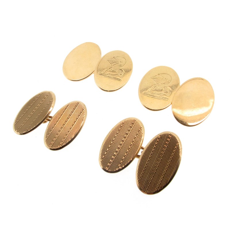A pair of yellow gold cufflinks, engraved with a helm crest, approximately 12g, case. A pair of 9ct gold cufflinks with engine turn decoration, approximately 6g.