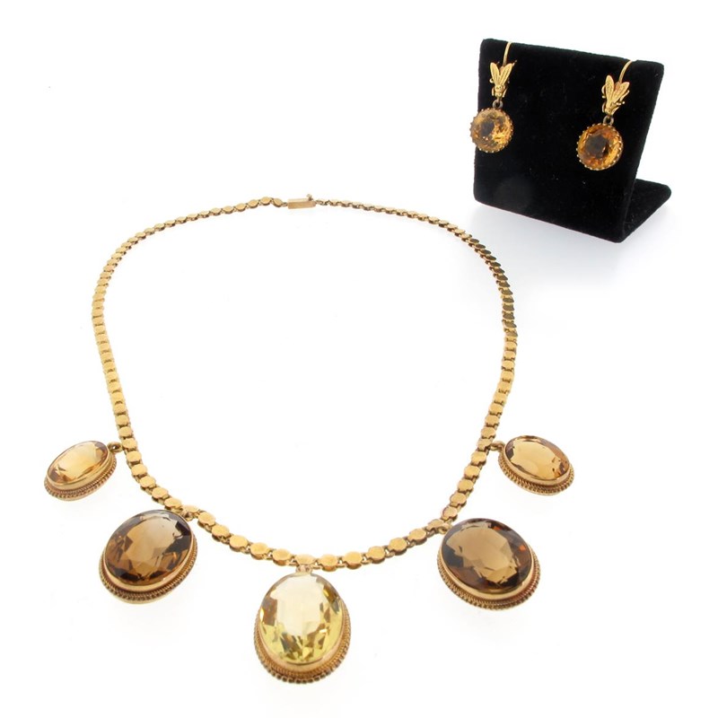 A gold necklace suspending five graduated oval-shaped citrines, and a pair of circular citrine-mounted gold earrings suspended from gold flies.