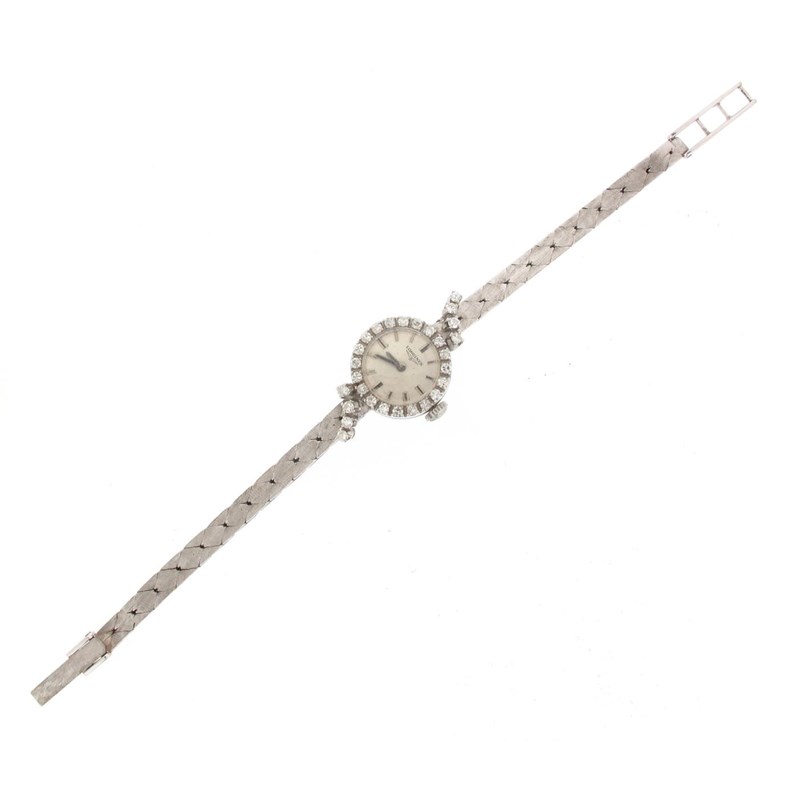 A lady's cocktail wristwatch by Longines, the signed circular dial with baton numerals. Set within a surround of circular-cut diamonds and eight diamonds set to the textured white gold band. 16cm long.