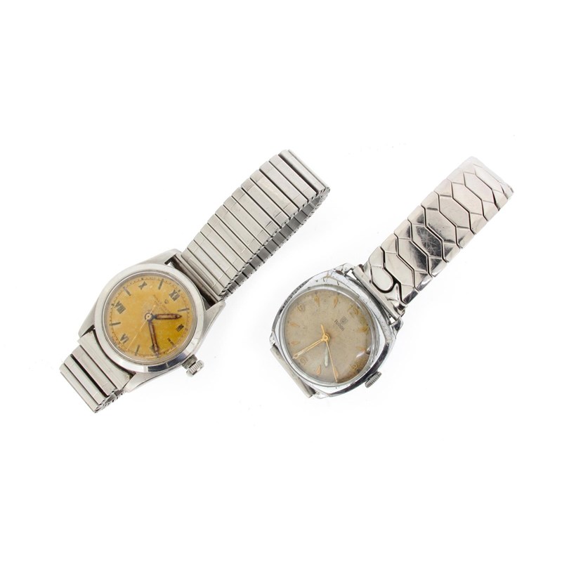 A steel Rolex Oyster Precision wristwatch, the signed dial with alternate baton and Roman numerals. Swing seconds hand, luminous hands and numerals and expanding steel band. A steel wristwatch by Tudor with signed dial, sweep seconds hand and luminous minute and hour hands and expanding steel band.