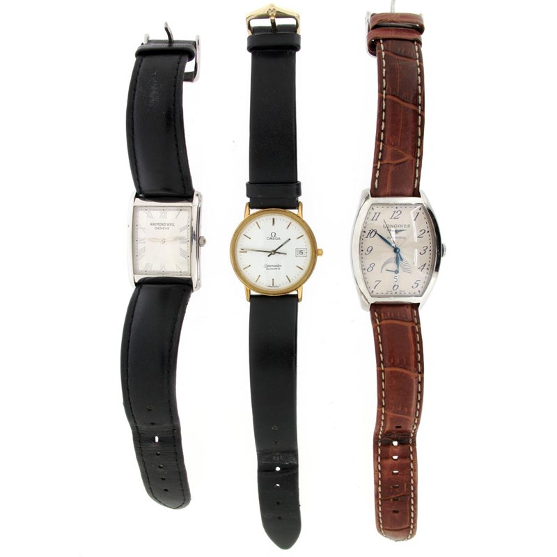 A Longines Evidenza steel wristwatch, the guilloche decorated tonneau dial with black Arabic numerals, swing seconds hand, date aperture and power reserve indication, automatic movement, leather band, Longines case. A Raymond Weil rectangular faced steel wristwatch, quartz movement, leather band, Raymond Weil case. An Omega Seamaster steel wristwatch, quartz movement and date aperture, Omega case.