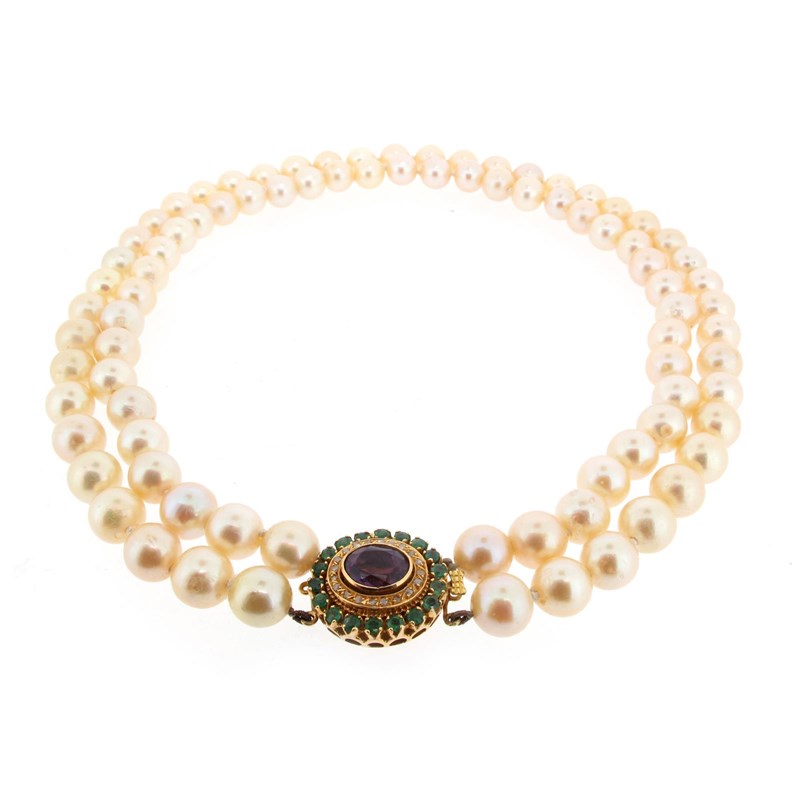 A two row cultured pearl necklace, the pearls measure approximately 9.5mm. 47cm long. The gold clasp set with an oval-shaped amethyst within a surround of rose-cut diamonds and a further border of emeralds.