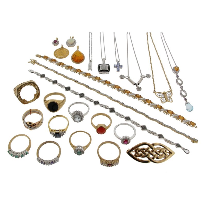 Assorted jewellery, including a ruby and diamond cluster ring set in 18ct white gold, a sapphire and diamond half hoop ring set in 18ct yellow gold, a further seven stone set 9ct gold rings. A 9ct yellow, white and rose gold puzzle ring, a gold locket ring and a gold ring mount. A gold brooch with a Celtic knot design. A 9ct yellow gold scroll diamond line bracelet and two other 9ct gold bracelets. A diamond and coloured stone set pendant in 9ct white gold with a white gold fine link chain and four other gold pendants, all with gold fine link chains. Three further stone set pendants and a 9ct yellow gold St. Christopher pendant.